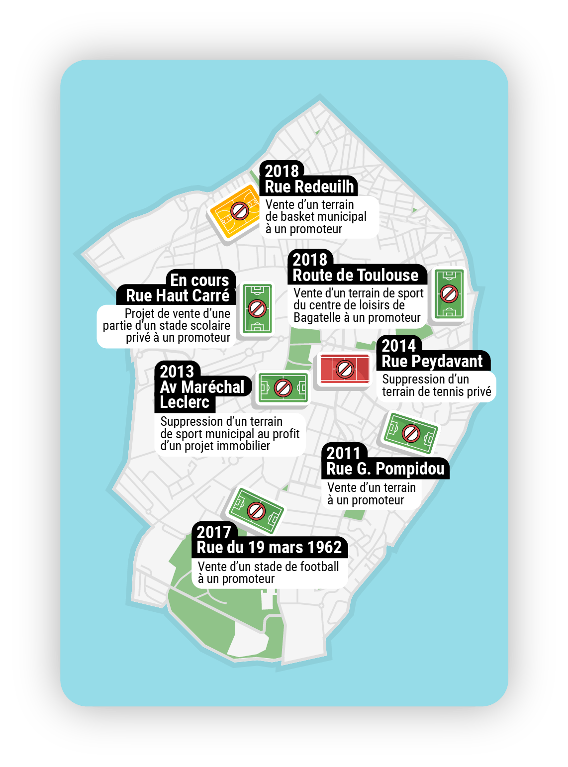 Depuis 15 ans, Talence voit disparaître ses terrains de sport de proximité, vendus les uns après les autres aux promoteurs immobiliers. Une braderie du patrimoine sportif, pour renflouer les finances de la ville, sans considération pour l’accès au sport des habitant·es et notamment des plus jeunes.